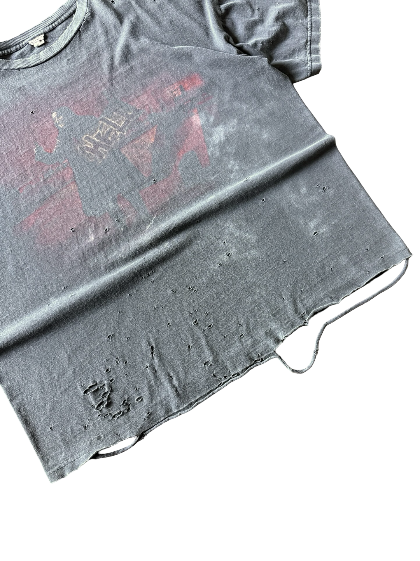 distress along the bottom of tee; faded throughout