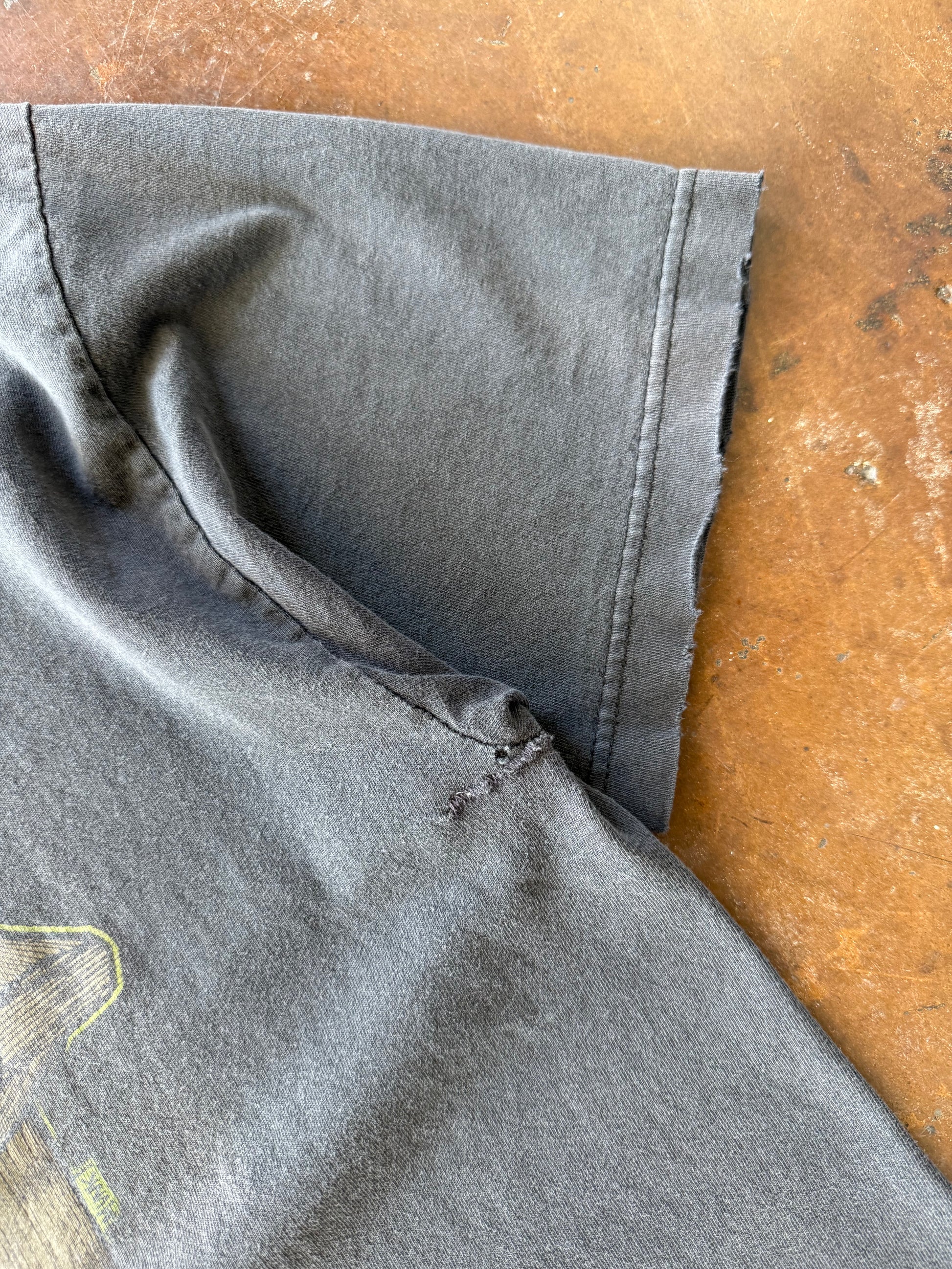 light wear & fade throughout shirt; professional repairs near both pit areas.